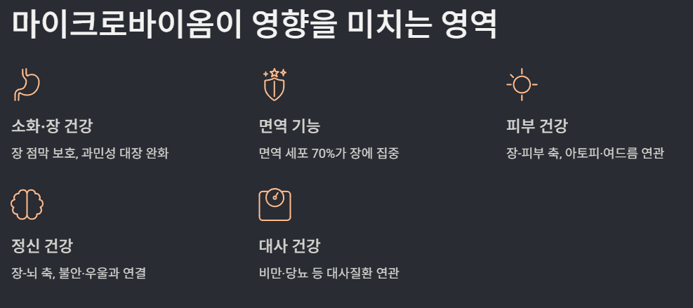 마이크로바이옴은 단순한 소화 보조 역할을 넘어, 면역 조절, 호르몬 분비, 뇌 신경 신호 전달에까지 깊이 관여한다는 사실이 최근 연구들을 통해 밝혀지고 있습니다. 암, 자가면역질환, 우울증, 자폐증 등과도 연관성이 확인되며 의학계에서 '제2의 장기'로 불리기 시작했습니다.