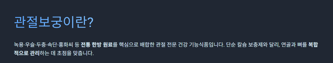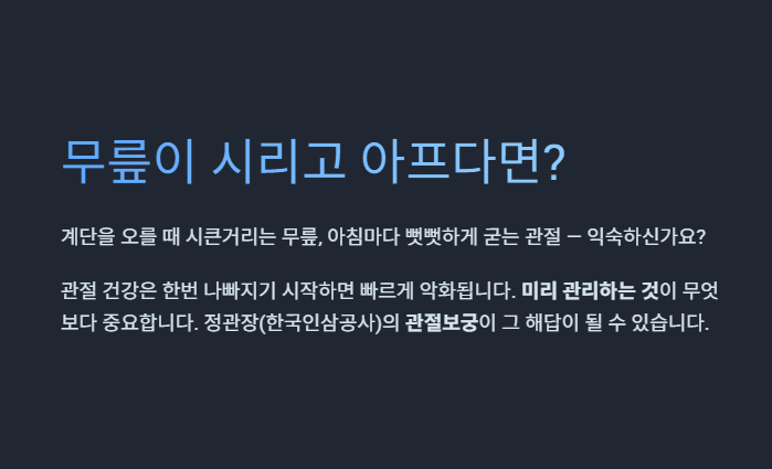 많은 분들이 검색하시는 관절보궁은 정관장(한국인삼공사)에서 출시한 한방 기반 관절 건강 기능식품입니다. 이 글 하나로 효능부터 가격, 복용법까지 모두 해결해드리겠습니다.