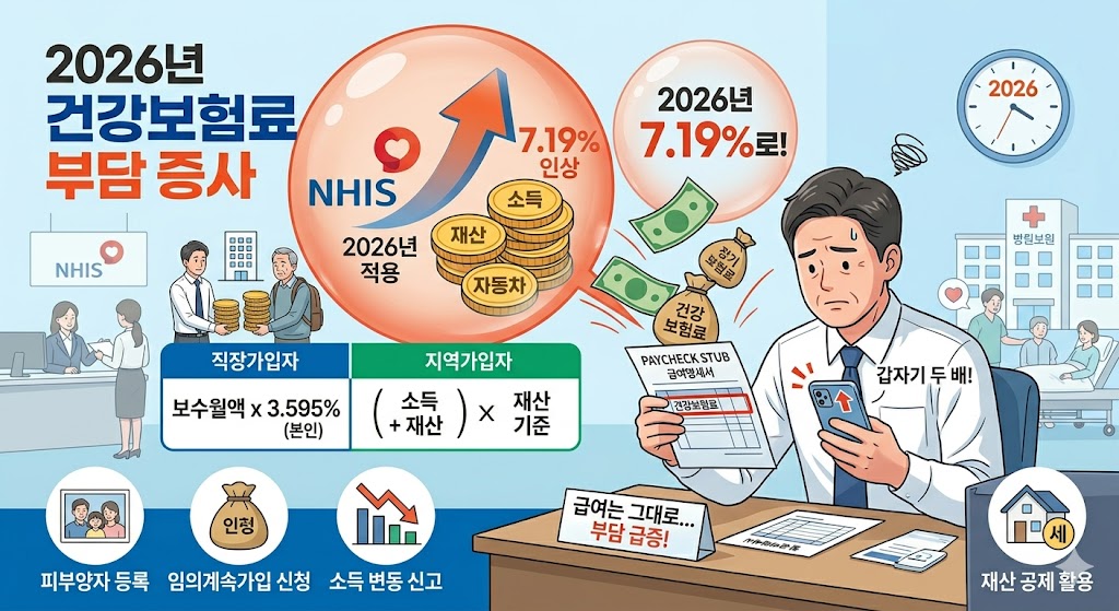2026년 건강보험료율은 7.19%로, 2년 연속 동결 후 1.48% 인상되었습니다. 직장가입자는 보수월액의 3.595%를 본인이 부담하며, 지역가입자는 소득과 재산을 기반으로 점수당 211.5원을 곱해 계산합니다.